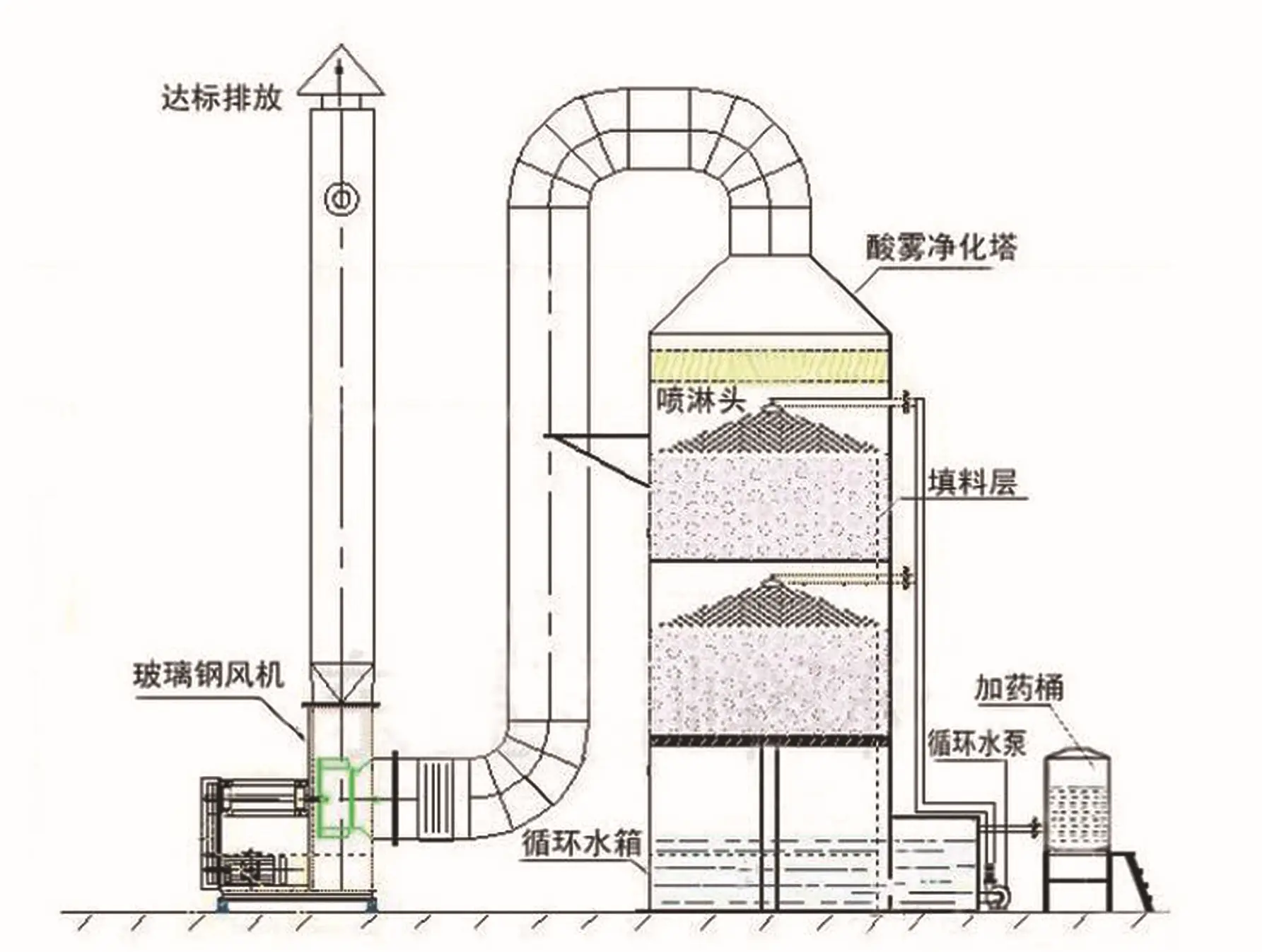 噴淋塔為實(shí)施噴淋法治理廢氣或回收原料的重要組成設(shè)備,故又稱為水洗塔、洗滌塔、凈化塔。根據(jù)廢氣類別及噴淋液的不同可分為水噴淋塔、酸噴淋塔、堿噴淋塔、油噴淋塔、水膜除塵/濕式除塵器;按形狀也可分為立式洗滌塔、臥式洗滌塔;按材質(zhì)又為分PP洗滌塔、玻璃鋼洗滌塔等。 噴淋塔運(yùn)行方式是不斷將酸霧廢氣由風(fēng)管引入凈化塔,將廢氣與氫氧化鈉吸收液進(jìn)行充分接觸吸收中和反應(yīng),酸霧廢氣經(jīng)過凈化后,再經(jīng)除霧板脫水除霧后由風(fēng)機(jī)排入大氣。吸收液在塔底經(jīng)水泵增壓后在塔頂噴淋而下,之后回流至塔底水箱內(nèi)如此進(jìn)行循環(huán)使用。凈化后的酸霧廢氣可以達(dá)到地方排放標(biāo)準(zhǔn)的排放要求,也會低于國家排放標(biāo)準(zhǔn)。
