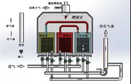 RTO把有機(jī)廢氣加熱到760攝氏度以上,使廢氣中的VOCs在氧化分解成二氧化碳和水。氧化產(chǎn)生的高溫氣體流經(jīng)特制的陶瓷蓄熱體,使陶瓷體升溫而“蓄熱”,此“蓄熱”用于預(yù)熱后續(xù)進(jìn)入的有機(jī)廢氣,從而節(jié)省廢氣升溫的燃料消耗。陶瓷蓄熱體應(yīng)分成三個(gè)(含三個(gè))以上的區(qū)或室,每個(gè)蓄熱室依次經(jīng)歷蓄熱-放熱-清掃等程序,周而復(fù)始,連續(xù)工作。蓄熱室“放熱”后應(yīng)立即引入部分已處理合格的潔凈排氣對該蓄熱室進(jìn)行清掃(以保證VOC去除率在99%以上),只有待清掃完成后才能進(jìn)入“蓄熱”程序。RTO蓄熱式廢氣處理設(shè)備,運(yùn)行費(fèi)用省,有機(jī)廢氣的處理效率高的優(yōu)點(diǎn),適應(yīng)廢氣濃度1000~10000mg/m3,分解效率:99%—99.5%。是目前較為經(jīng)濟(jì)可靠的達(dá)到50mg/m3嚴(yán)格的排放標(biāo)準(zhǔn)的VOCs治理技術(shù),得到了廣泛的應(yīng)用。