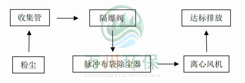 精雕機工作時產生的粉塵通過集氣罩、吸塵軟管進入到脈沖布袋除塵器中過濾凈化,粉塵落入灰斗凈化后的廢氣通過系統風機達標排放。