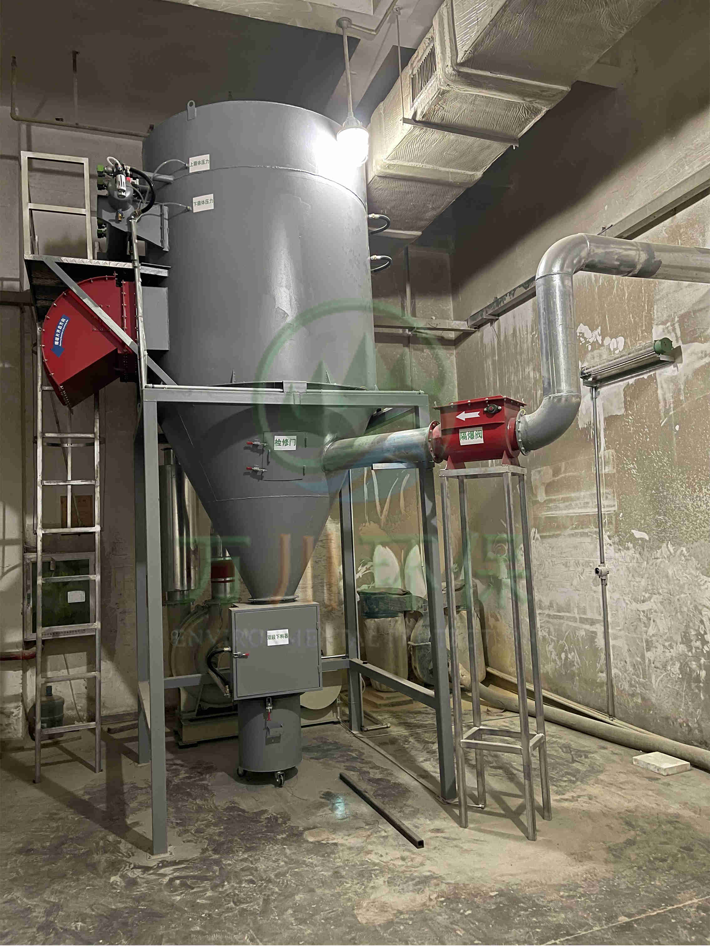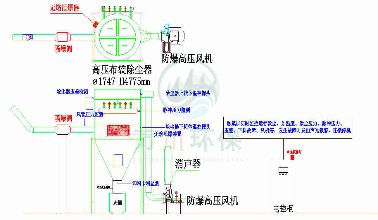 萬川配套一套脈沖布袋除塵器+防靜電布袋+防爆除塵風機+防爆卸料器+無焰泄爆器+隔爆+自動化電控柜系統。